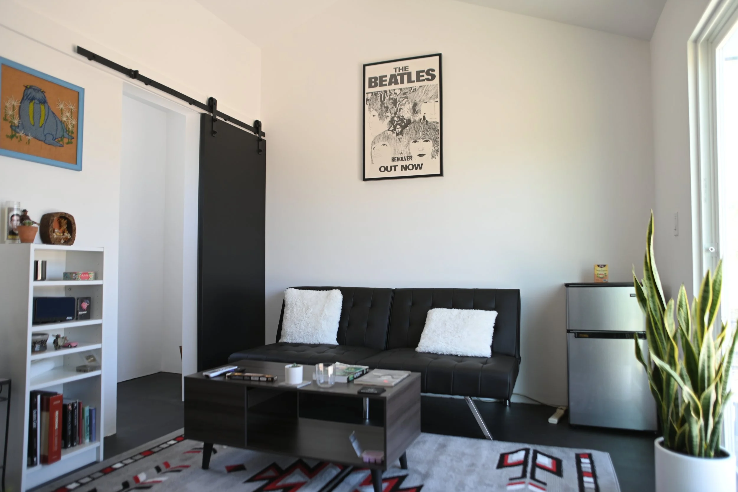 Replacing the existing roof with a prefabricated scissor truss increases ceiling height and provides better sound acoustics for recording purposes.
